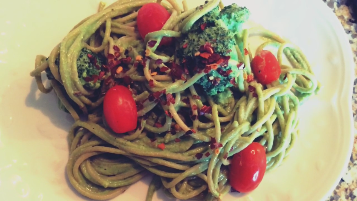 Cook 8 oz pasta according to the packaged instructions. Top pasta with broccoli, halved cherry tomatoes, and the spinach pesto. Add red chili flakes if desired. Toss well and enjoy!